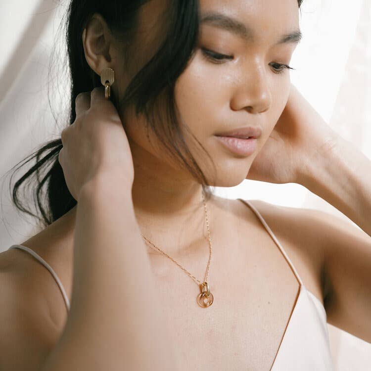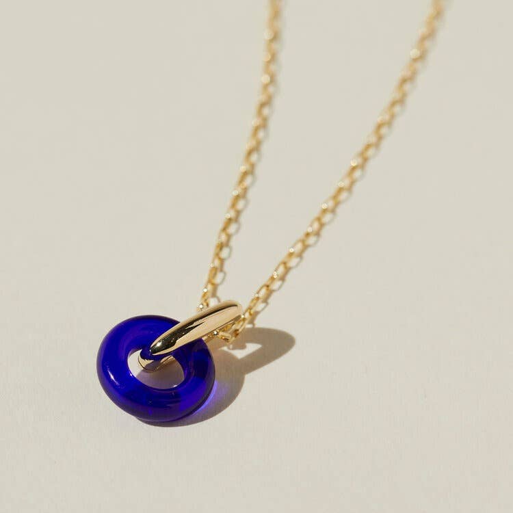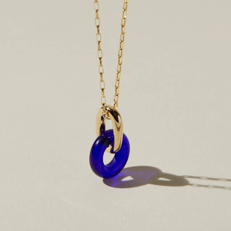 A modern staple with a pop of color! A hand cast and polished oval link coupled with a cobalt blue glass ring. You can choose your chain length to fit perfectly with other layering necklaces or wear it solo.