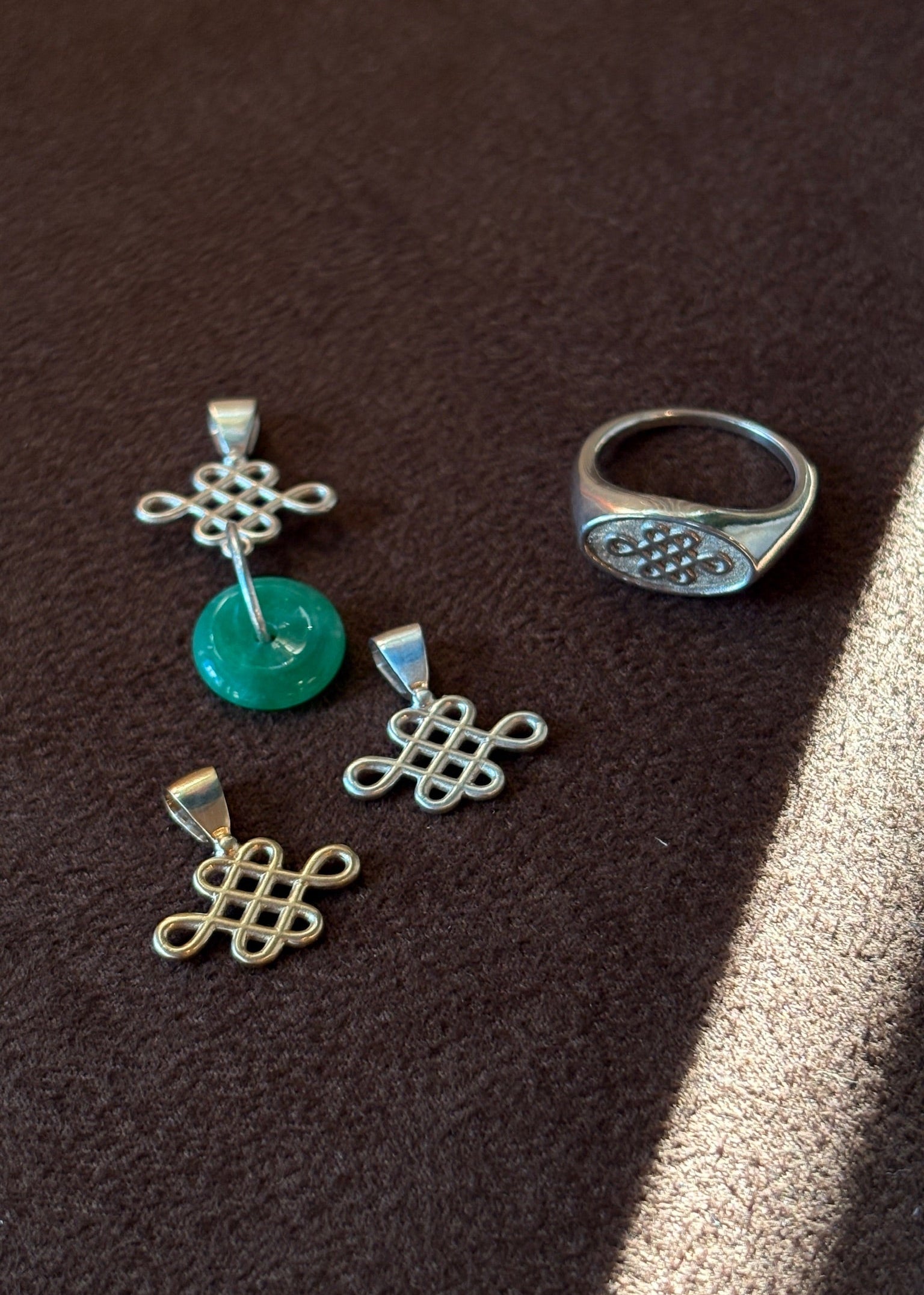 Taken from our storefront, Aiyah, logo. The Chinese Knot represents good luck and prosperity. A red knot was gifted to me by my mom before opening up the store, and it inspired the red details and knot you see around our space.