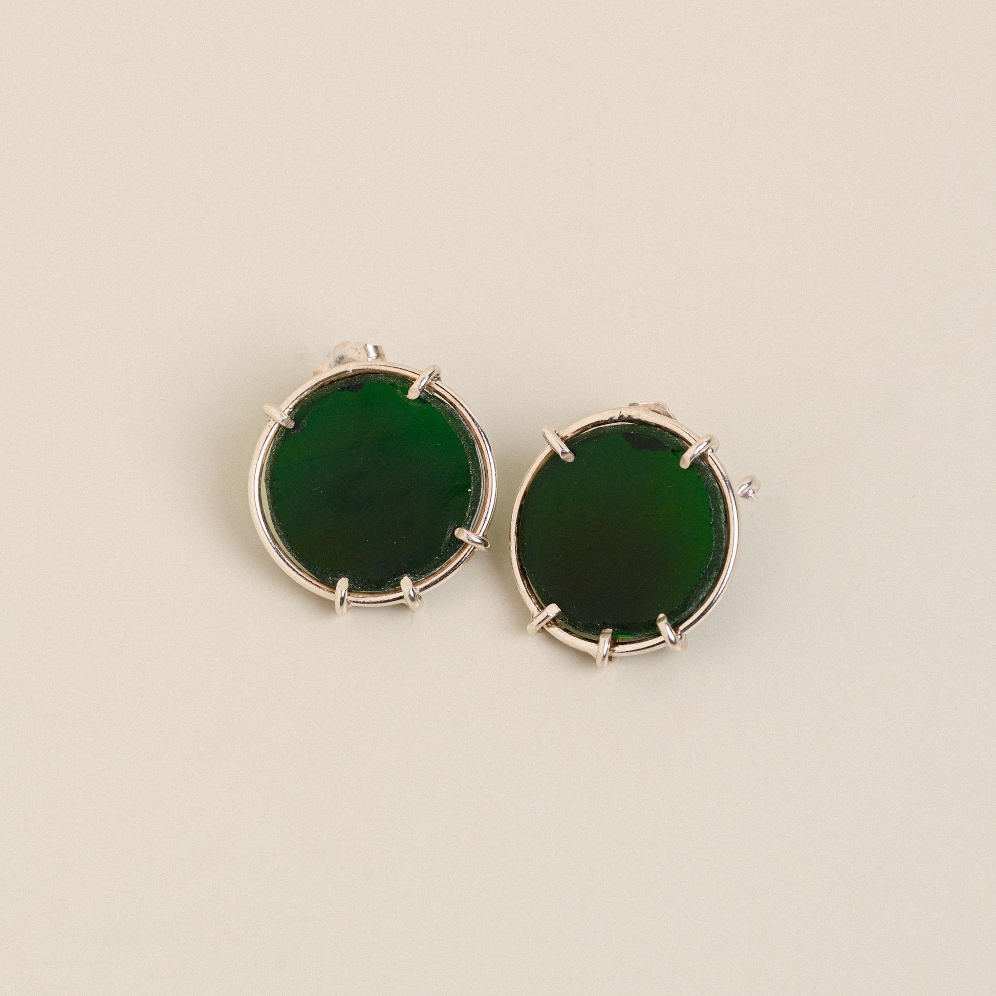 Dark green studs that brighten up in the light made from upcycled glass in sterling silver.