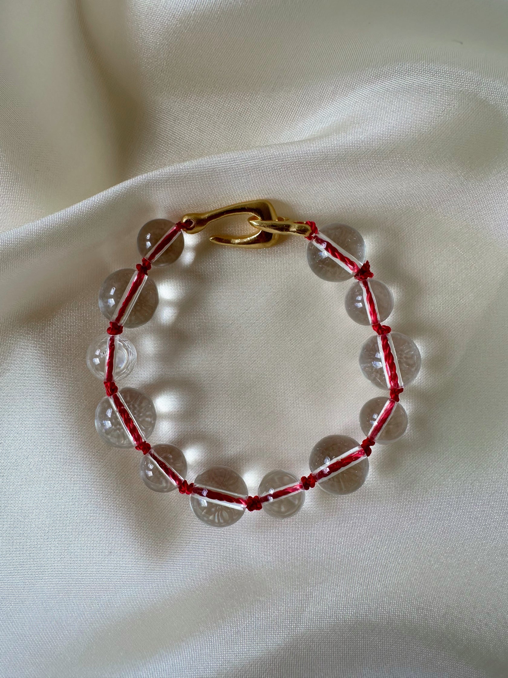 Clear quartz hand-knotted on red silk, finished with a hand-carved fish hook closure, made using the ancient lost wax technique.
