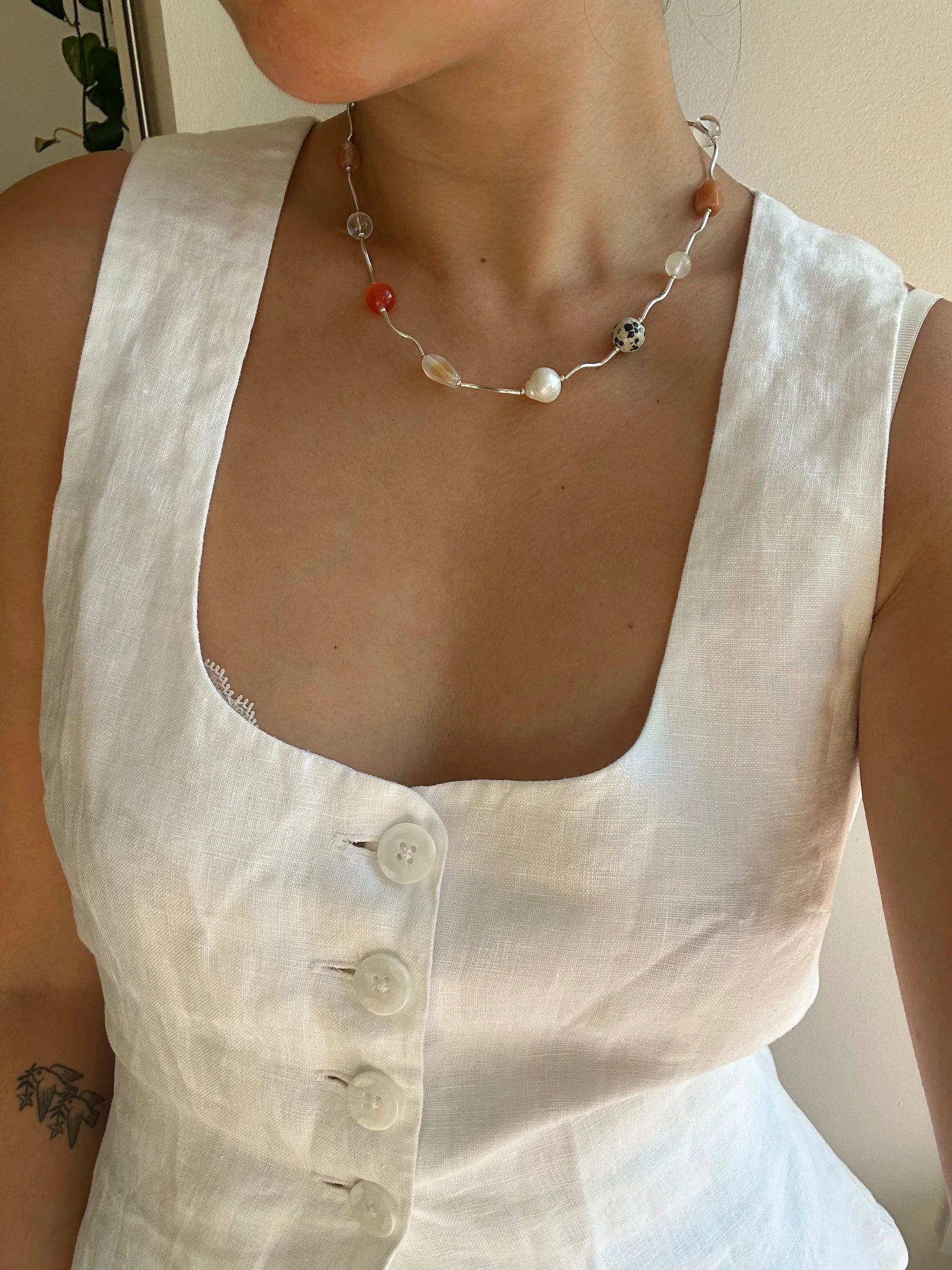 A circle of wavy, undulating lines in sterling silver. Featuring a curation of earthy, delicate gemstones such as unakite, dalmatian jasper, freshwater pearl, and colored jade. A perfect transitional piece for your wardrobe. Handmade in East London.