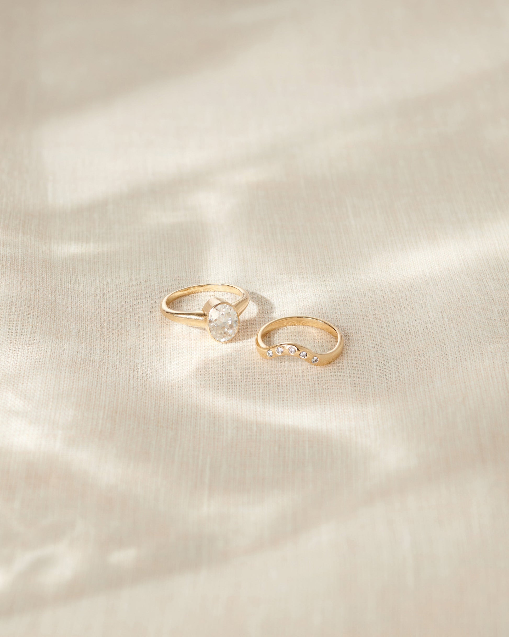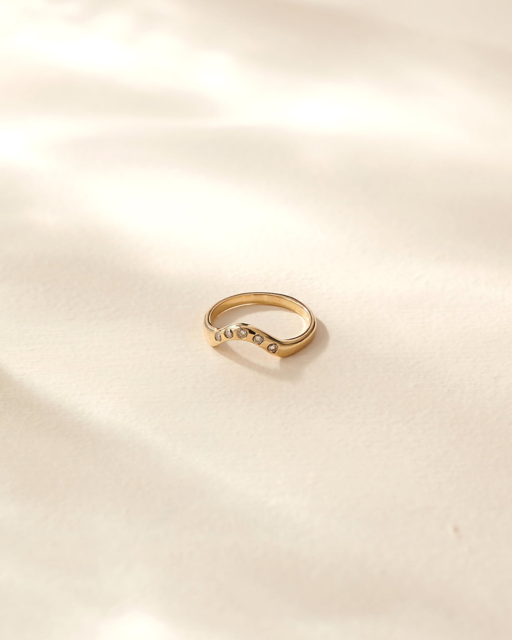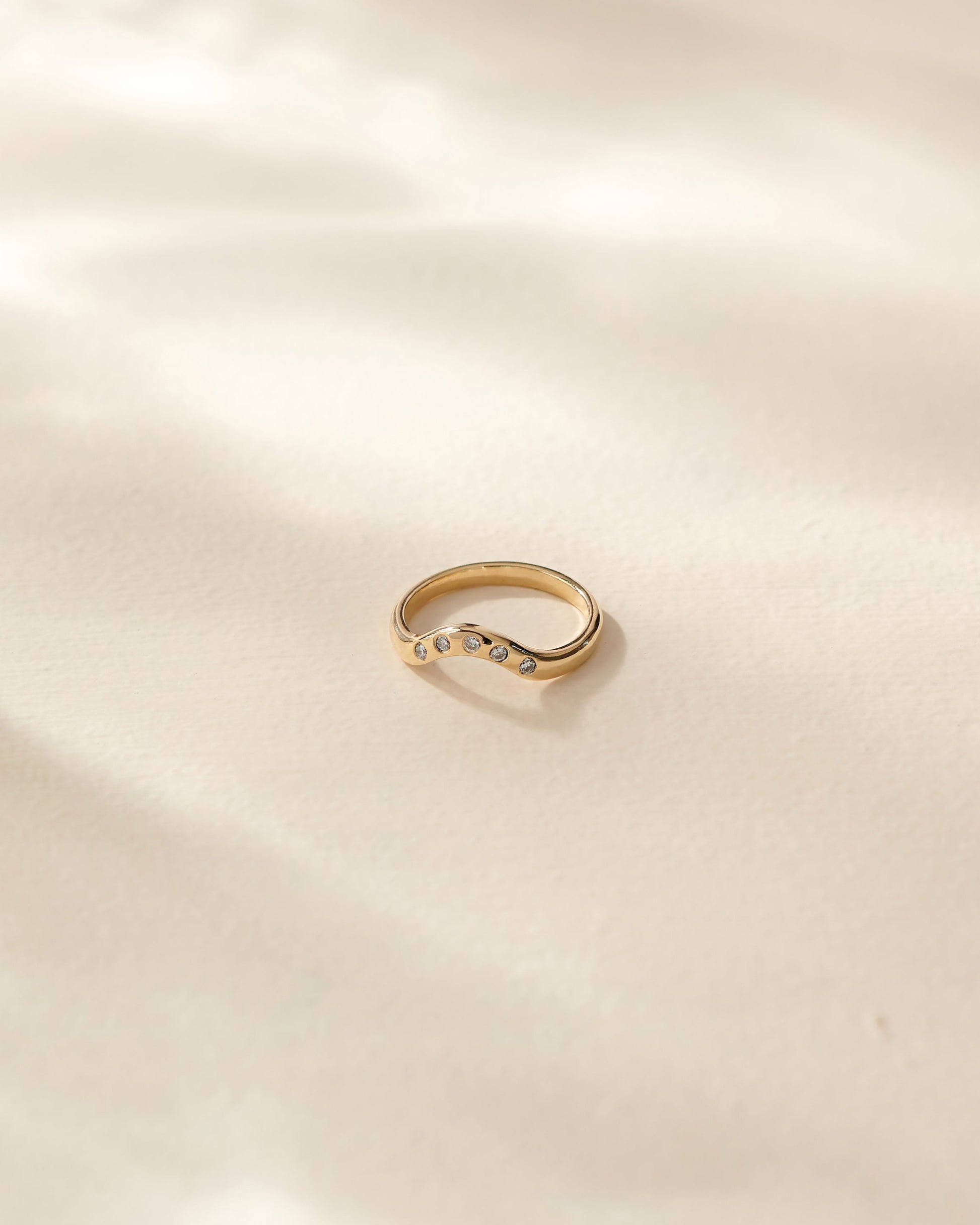 Crafted with a curved band, the Diamond Crown Ring frames your other gemstone rings beautifully. The 5 diamonds add a touch of sparkle, in either natural champagne or lab white. A modern and understated wedding band with just the right amount of bling.