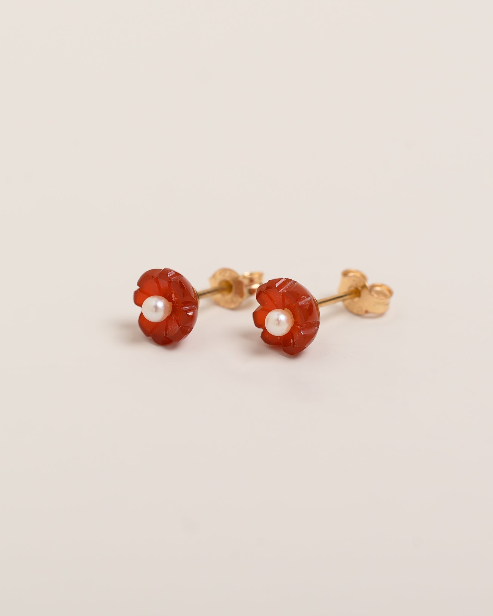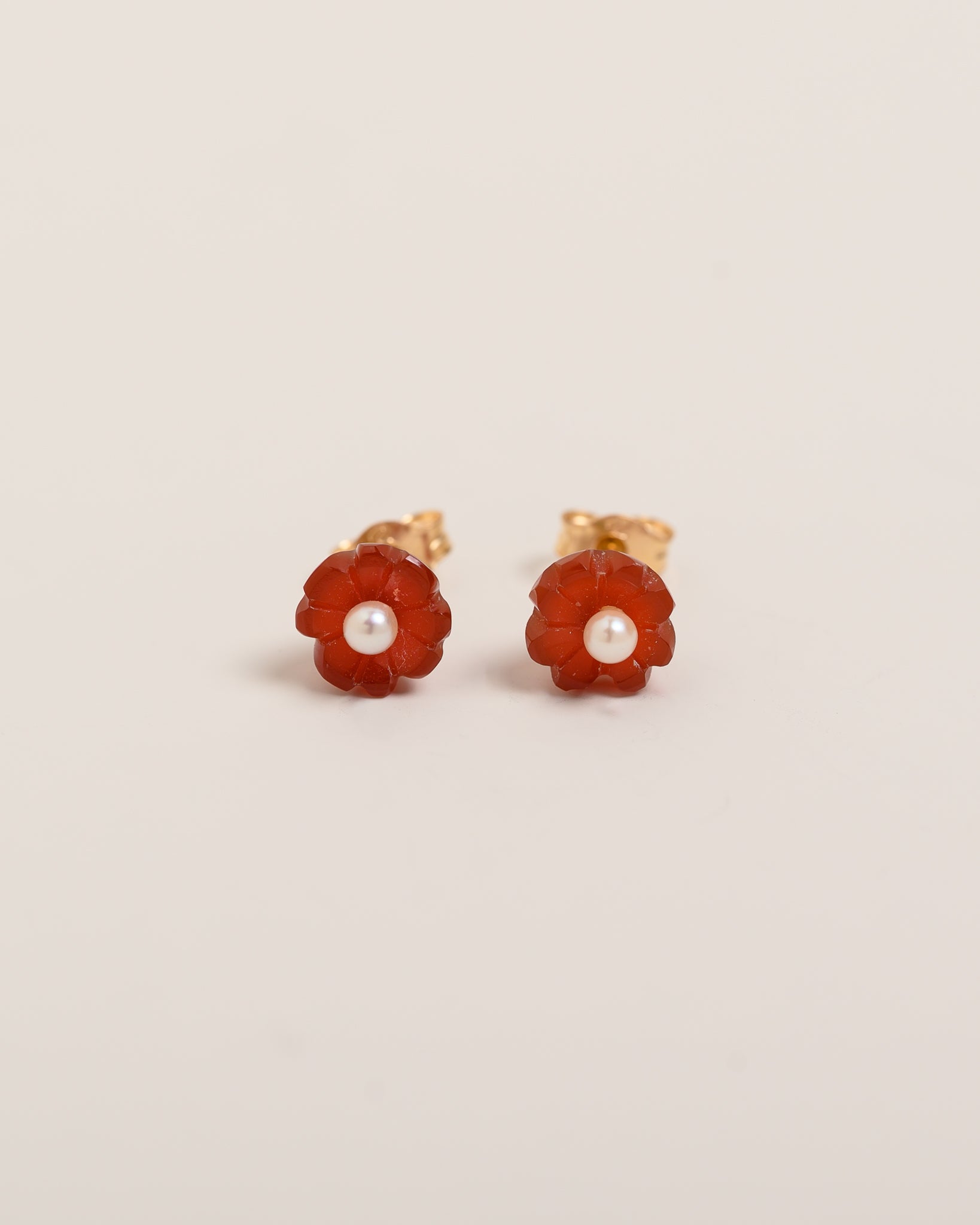 Cutie flower stud earrings crafted from carnelian and small pearls, set on solid 14k gold posts. The warm red orange of the carnelian pairs beautifully with the white pearls.