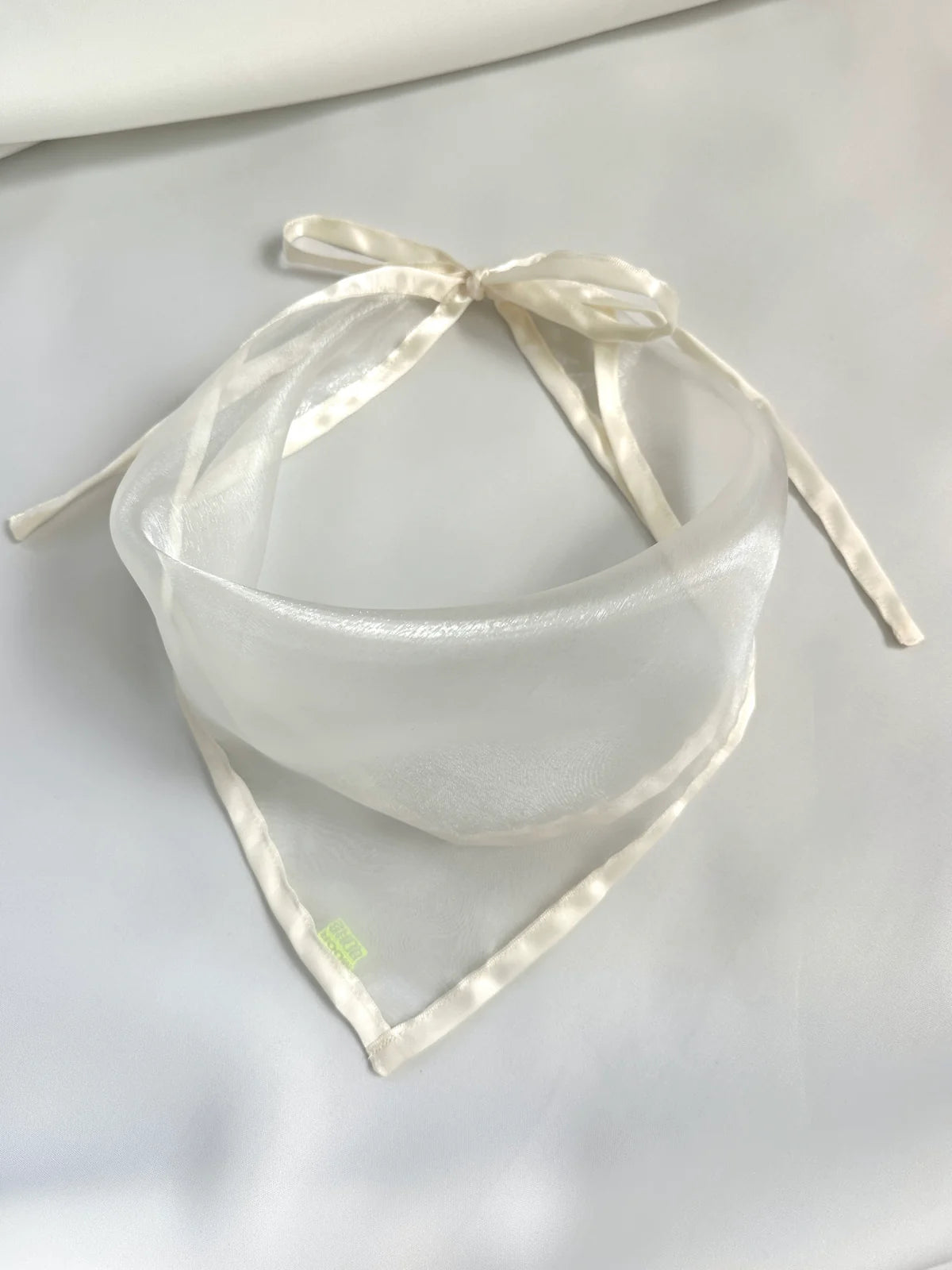 Dreamy sheer organza framed with silky satin ribbon in an easy tie back headscarf, also extremely cute as a neck scarf.