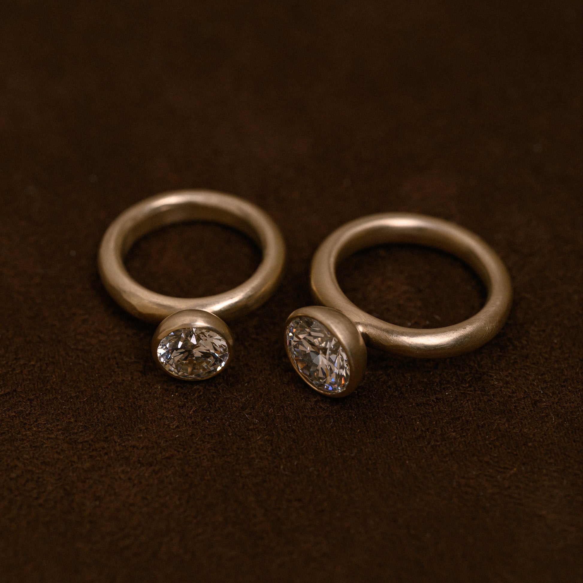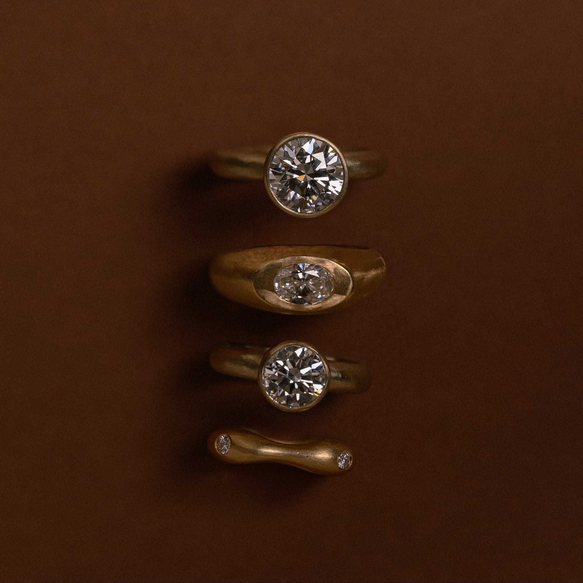 A sculptural engagement ring made of solid gold and a lab grown diamond.
