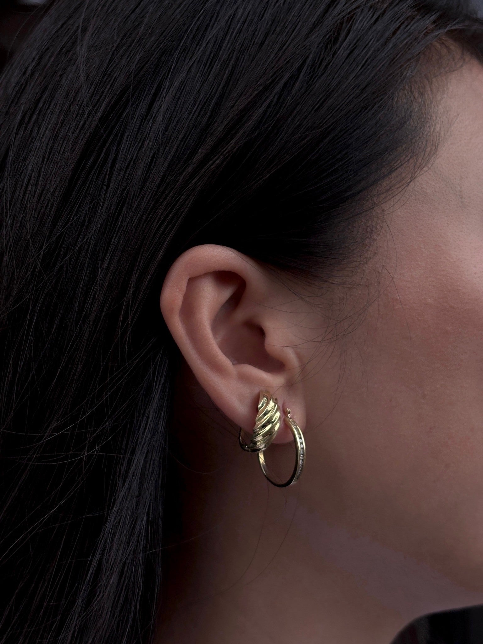 Chunky vintage hoop earrings in solid 14k yellow gold. These hoops feature a beautiful, textured rope or twist pattern on the front. They have a sturdy click-to-close clasp, making them easy to put on and secure for daily wear.