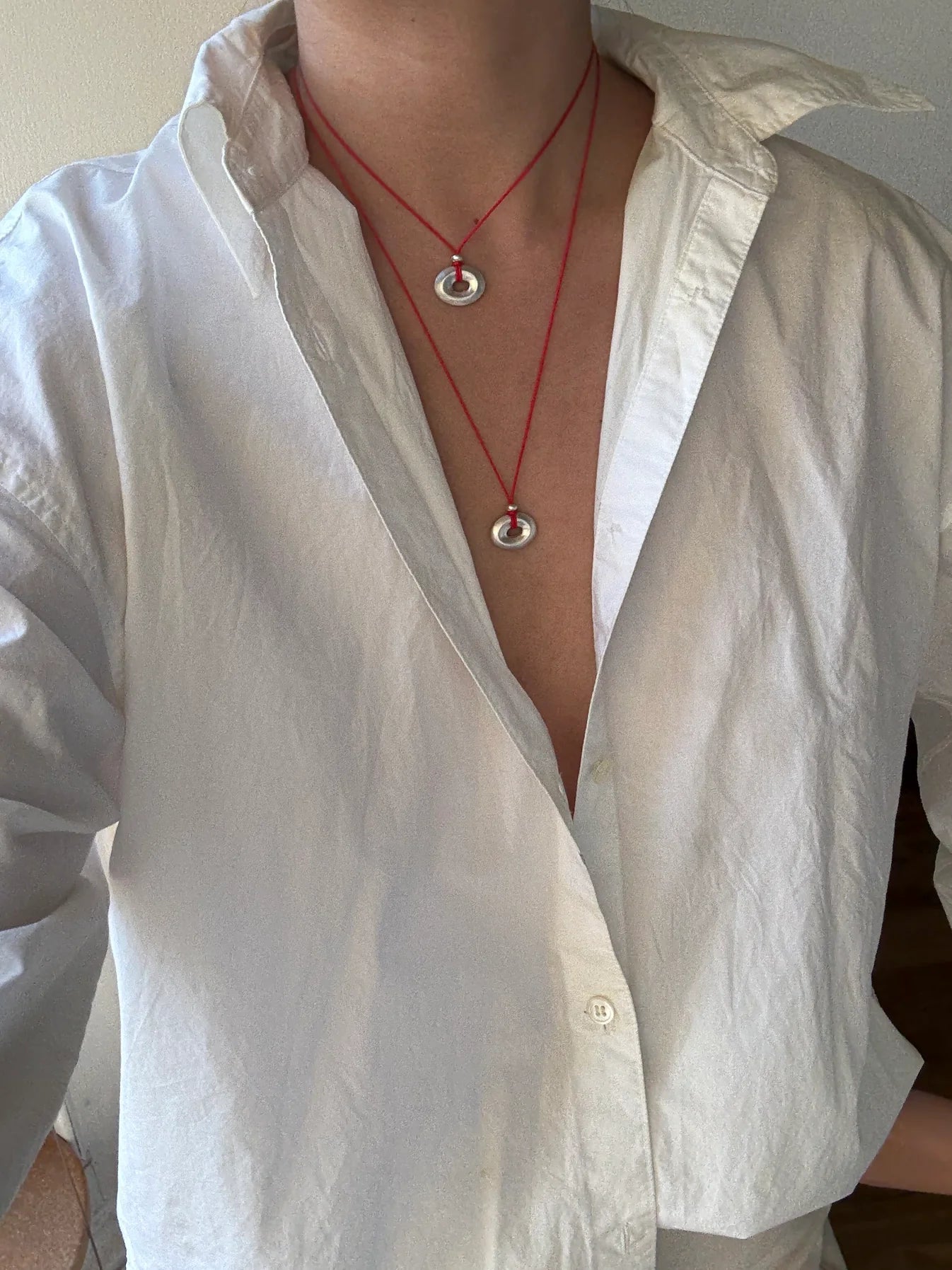 A play on the traditional 'lucky jade' charm. Designed to evoke a similar sense of intimacy and comfort. Softly sloped silver, hand-wrought and strung on red thread.
