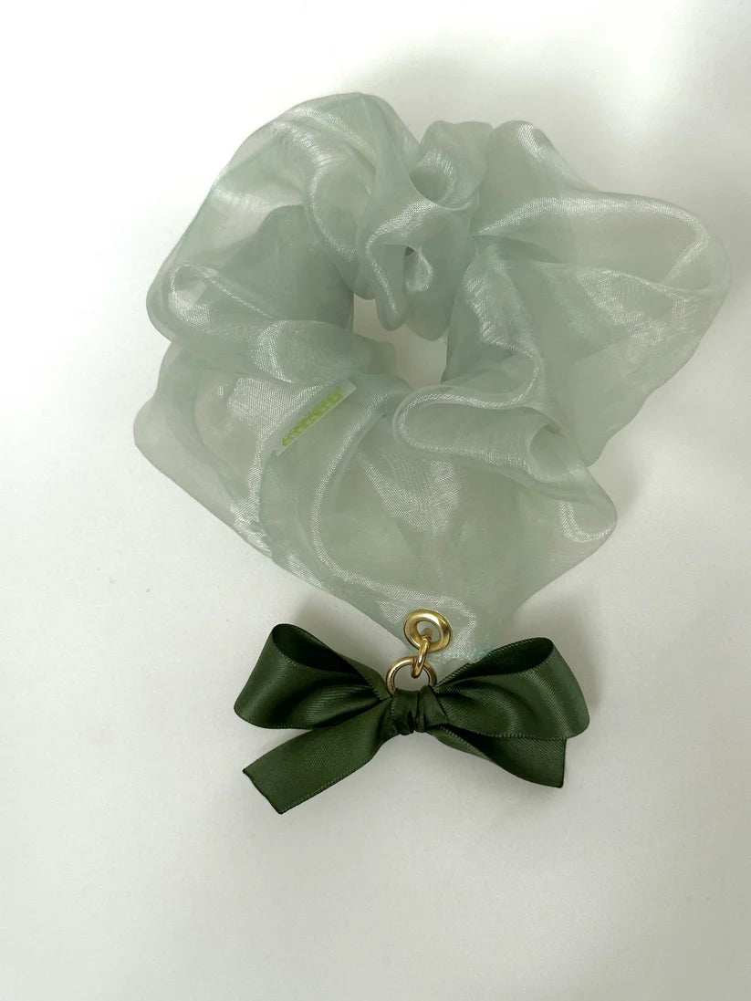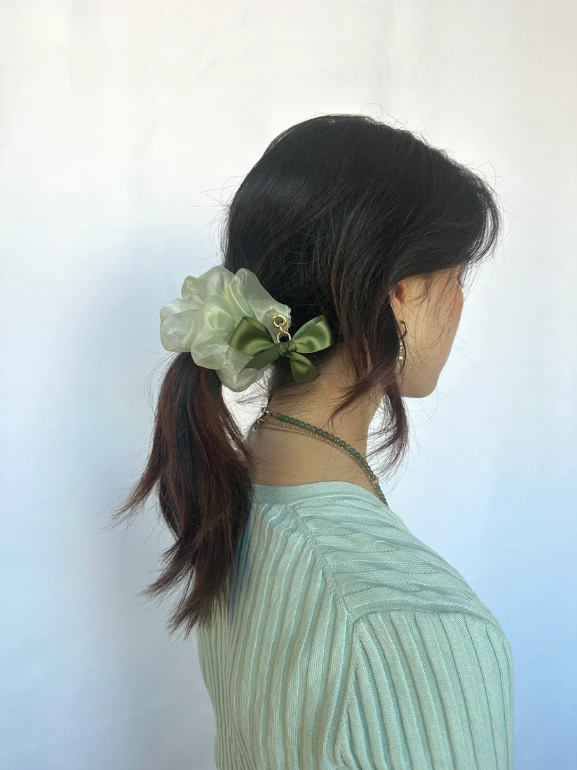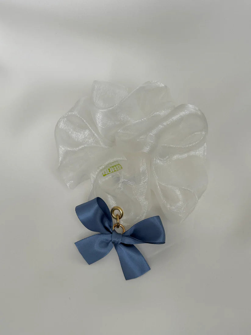 Add a charming touch (get it) to your hair with the Elaine Bow Charm Scrunchie. This mini organza scrunchie features a delicate grommet and a satin bow charm, perfect for adding a playful and stylish flair to your hairstyle.