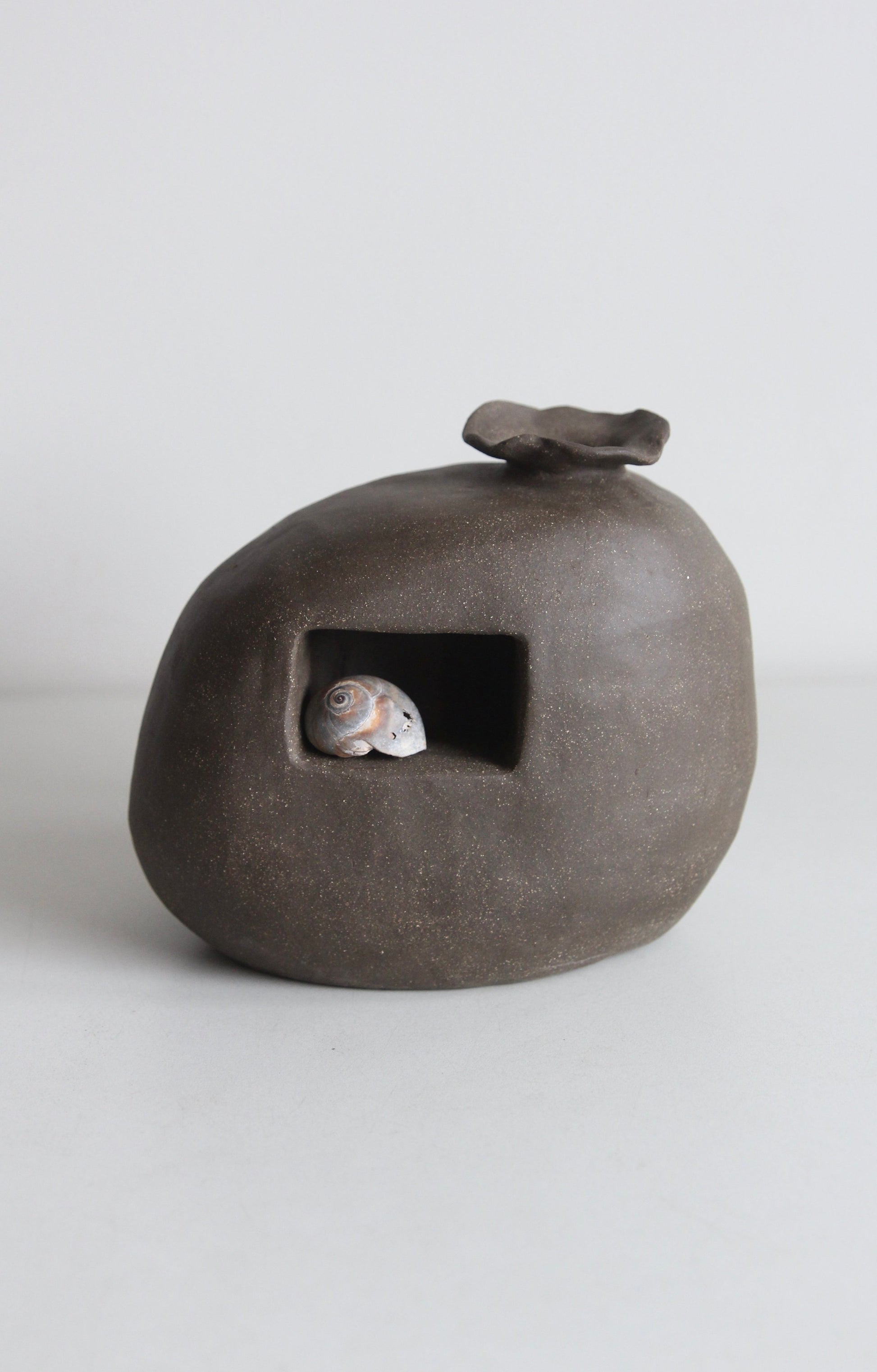 Dark brown speckled stoneware with niche by Steph Trowbridge. No glaze inside.