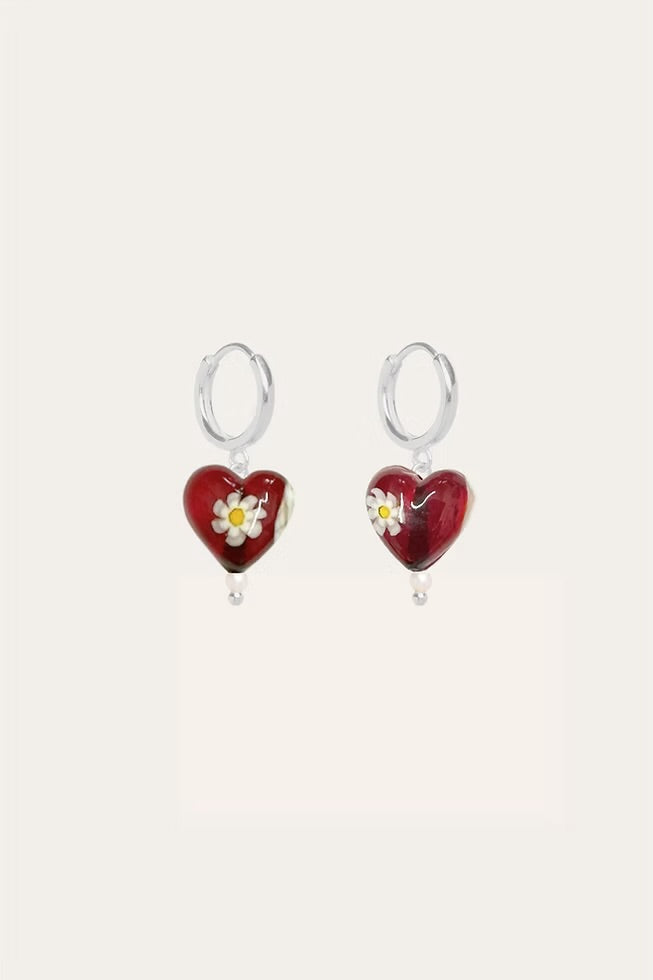 Millefiori heart bead with a vintage acrylic pearl. Each pair is made with 18k gold plated sterling silver huggie hoops.