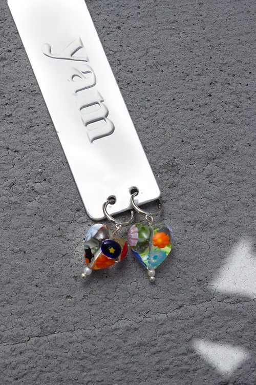 Millefiori heart bead with a vintage acrylic pearl. Each pair is made with 18k gold plated sterling silver huggie hoops. All hearts are lampwork glass beads and handmade in studios in Italy. Due to the handmade nature, all heart charms are unique and one of a kind.