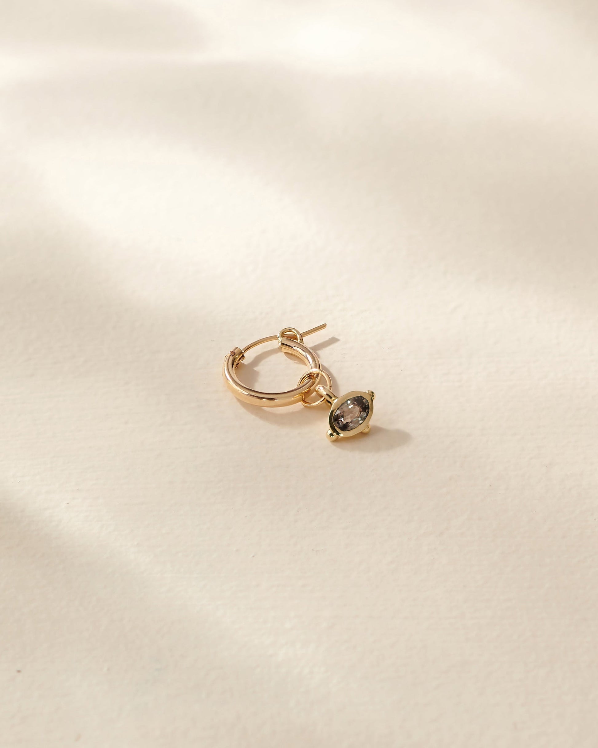 A little single 14k gold hoop earring to add to your ear story featuring the Rise and Rest pendants. Choose from the vertical Rise charm or horizontal Rest charm in either teal or brown sapphire.