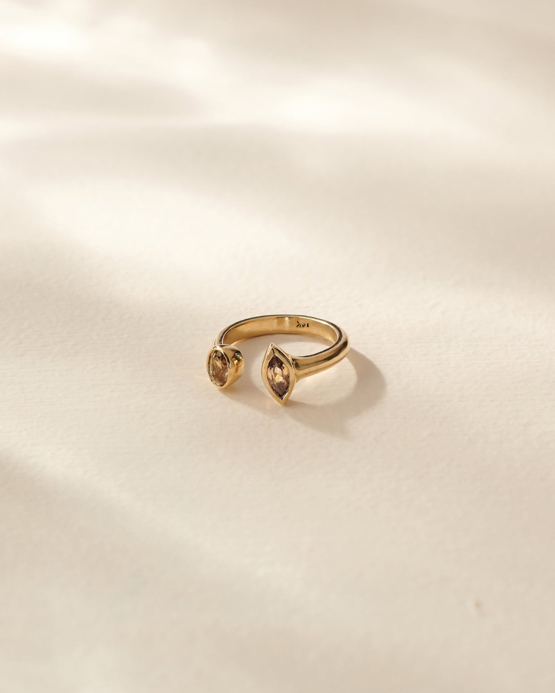 A twist on a classic toi et moi. Made with 14k yellow gold and two brown sapphires. Slightly adjustable.